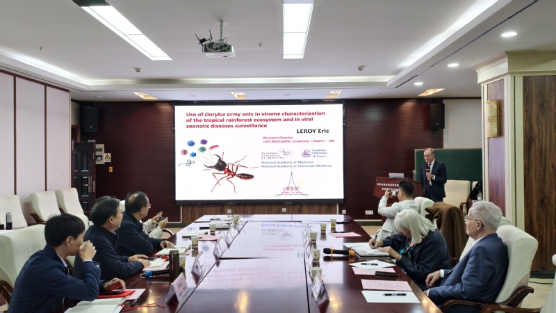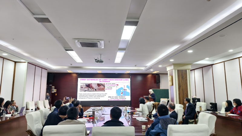 随后,Eric Leroy院士以《利用矛蚁属行军蚁进行非洲雨林生态系统病毒组表征及病毒性人畜共患疾病监测研究》为题,系统介绍了其团队在非洲雨林地区开展的工作,阐述了基于行军蚁对非洲雨林生态系统病毒组表征及病毒性人畜共患疾病监测的研究,为非洲雨林地区新发病毒提前预警提供了新思路。Jeanne Bruyère-Picoux院士在《传染性结节性皮炎于2025年6月29日首次在法国出现:防控措施的落实》报告中,分享了2025年6月法国首例病例的流调溯源与防控经验,并就边境动物防疫提出针对性建议。两场报告内容前沿、案例详实,师生就病毒生态网络、大数据监测平台搭建等问题进行了深入交流,现场互动热烈。